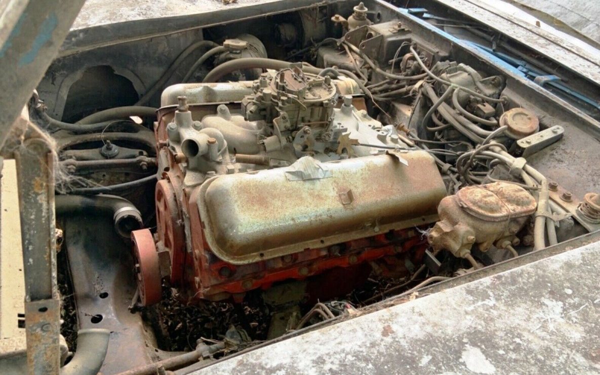 The all-blue theme continues inside, and (to most eyes) that’s much better than, say, all green or all gold. The transmission is described as “missing” but if it was originally a four-speed that would certainly make this find more interesting. What would you give for this entry-level big-block ‘Vette?