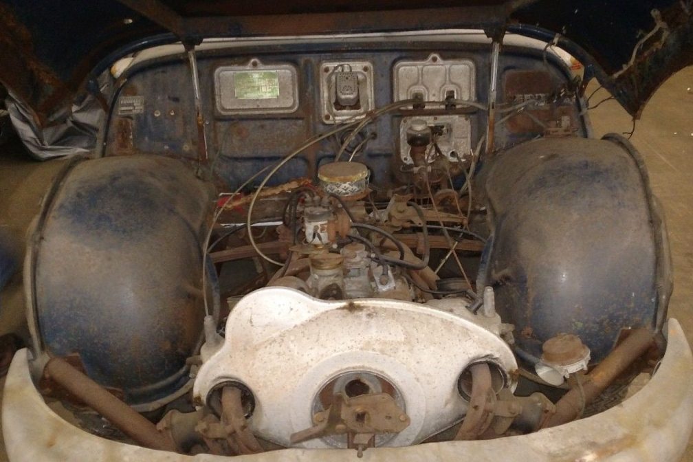 The PL17 was powered by an 850cc twin cylinder, air-cooled boxer engine. With a power output of a mere 42hp it was never going to be a jet. Thanks to the advanced aerodynamics that little engine could push this little car to a top speed of 81mph. How good were they? In 1961 a Panhard PL17 actually won the prestigious Monte Carlo Rally….and to prove that it was no stroke of luck PL17s also finished second and third! Lurking in that cavernous engine bay is that mighty little engine. As the car is a front wheel drive, the 4-speed manual transmission is also in there somewhere.