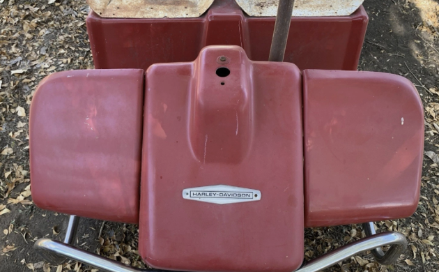 Harley’s foray into golf carts (aka “LSV”, or low-speed vehicle) began in 1963. The first of the breed was a three-wheeler powered by a 245 cc dual-cycle, single-cylinder, air-cooled engine fueled by a 50/50 gas/oil mix. Steering was via a hoop that operated like a tiller. The bodies were fiberglass. Strong sales spurred the development of other models, including four-wheelers with conventional steering controls. Research suggests that Harley first made an electric cart in 1969, but I was able to find a ’66 powered by 36 volts. Had our seller been willing to serve up a few more photos, we’d see that the entire rear of this body lifts to reveal the battery compartment.