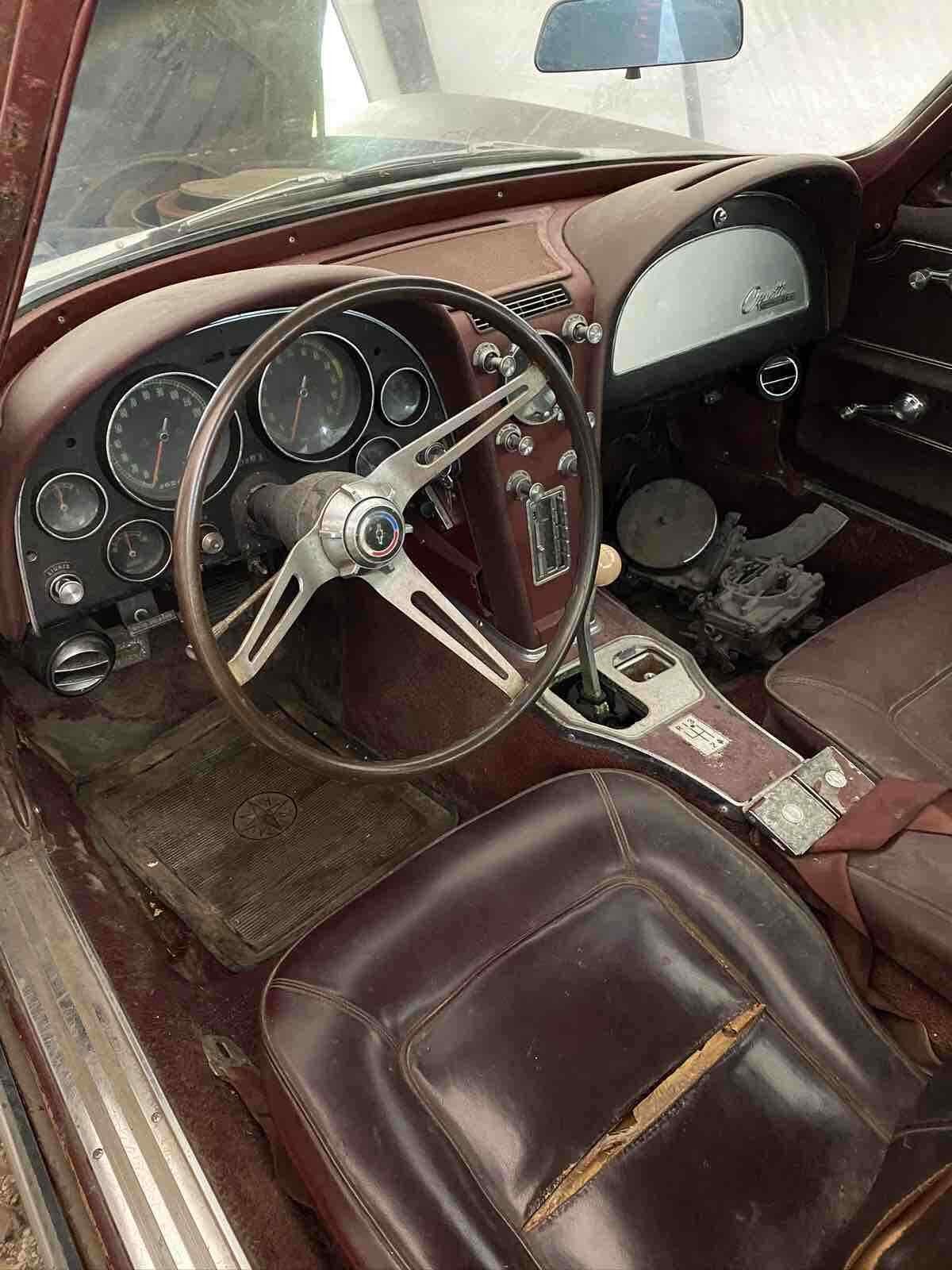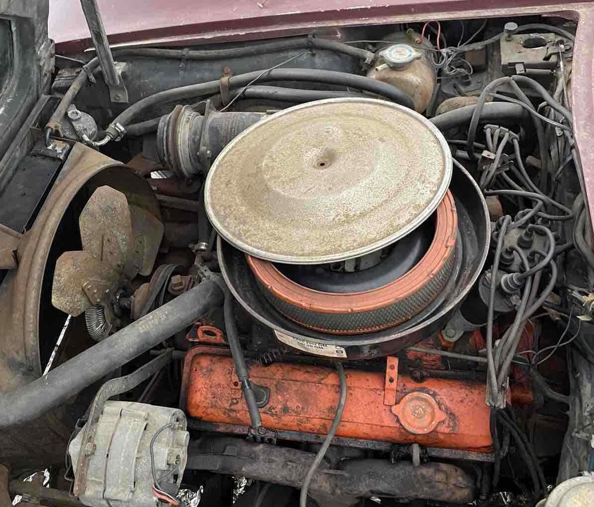 Two motors come with the maroon/maroon car, neither one original. Under the hood is a 327 that runs, but poorly. And the other is a 300-horsepower 327 that was reportedly rebuilt.