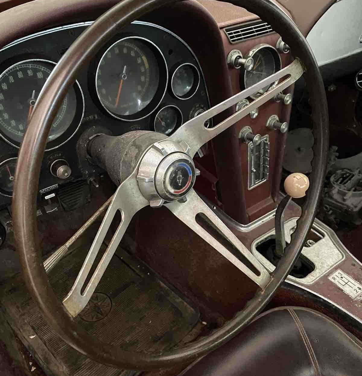 The interior is one of the car’s better features, since everything is still there, including one of those cool vertical radios only seen in Corvettes. The car was very well-equipped—the telescoping steering wheel is a rarely seen feature. The seats are torn up, but again not aggressively awful. Everything’s filthy—it’s a true barn find.