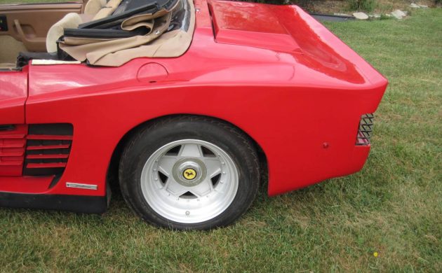 So, here’s what I can appreciate about this particular Ferrari clone: the taillights, with the cosmetic grills running over them and creating the illusion of being tinted, is faithful to the actual Ferrari design. In addition, the big win here (at least cosmetically-speaking) is the staggered wheel setup that actually look like they came standard on a Ferrari. This is my biggest gripe against kit cars and replicas is that the wheel and tire setup never comes close to faithfully mimicking the originals. These were supercars back in the day so they had outrageous specifications that included staggered setups with deep dish lips and ridiculous offsets. This replica at least attempts to get that part right.