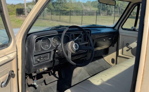 There’s no NP435 four-speed manual here (the standard transmission choice); this one has the optional three-speed automatic with a column selector. That’s showing some surface rust, as a lot of them do over the decades. Speaking of other rust, there isn’t much to speak of, it sounds like. It must have lived in a dry part of Texas. The basic vinyl seat still looks almost like new, and I don’t see any glaring issues inside, including the dash. Hagerty is at $5,400 for a #4 fair-condition truck.
