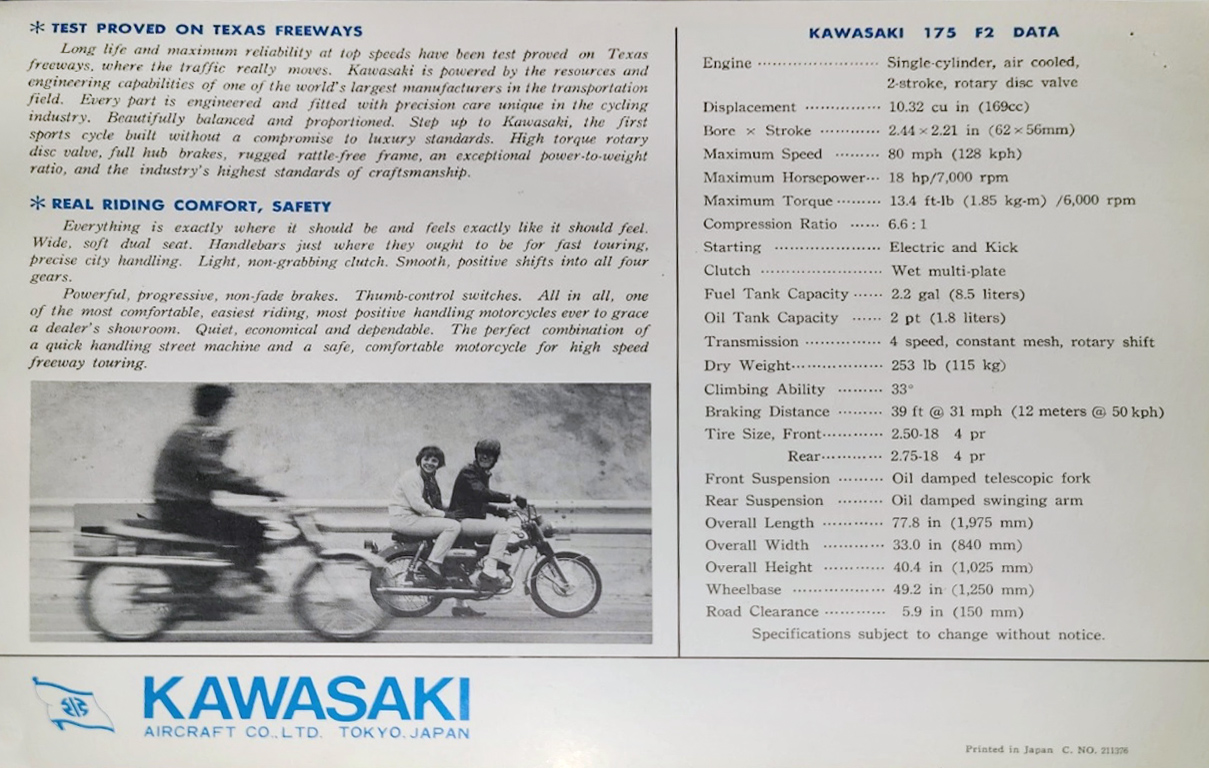 Someone rode this motorcycle a lot, with just over 6,000 miles showing on the odometer. It’s a single-cylinder, so that’s a lot of buzzy miles to have put on. Maybe they used it to commute to work in the city, which would be perfect, other than the 99.99997% of texting drivers around you not paying attention to anything other than trying to type LOL or watch cat videos. A brochure says the F2 175 was “test proved” for speed and longevity on Texas Freeways, so maybe it’s better than I imagined it would be at highway speeds.