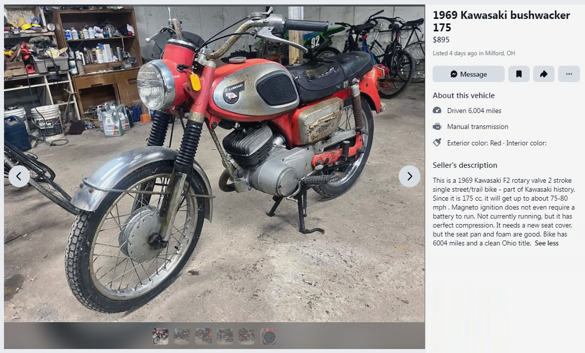 The seller has this bike listed as a Bushwacker, but the Bushwacker is an on/off-road version of Kawasaki’s 175, with beefed-up handlebars, an upswept exhaust, and more off-road features. This is clearly a street bike. This 1969 Kawasaki 175 F2 can be found listed here on Facebook Marketplace in Milford, Ohio, and they’re asking $895. Here is the original listing, and thanks to Pnuts for the tip!