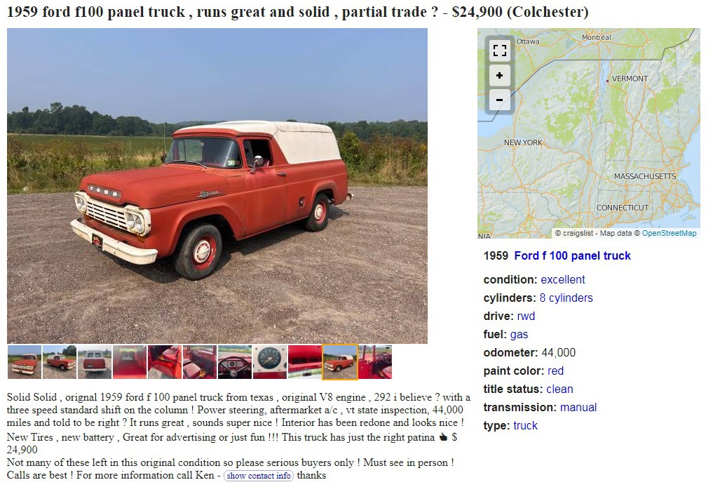 This 1959 Ford F-100 Standard Panel appears to be what Ford referred to as Vermillion for its red color in this year. The white paint scheme on top is pretty unique; most of them would have been white above the body line, matching up with the bottom of the hood. The seller has this very cool truck posted here on craigslist in far northern Vermont, Colchester to be exact. They’re asking $24,900, here is the original listing, and thanks to Mitchell G. for the tip!