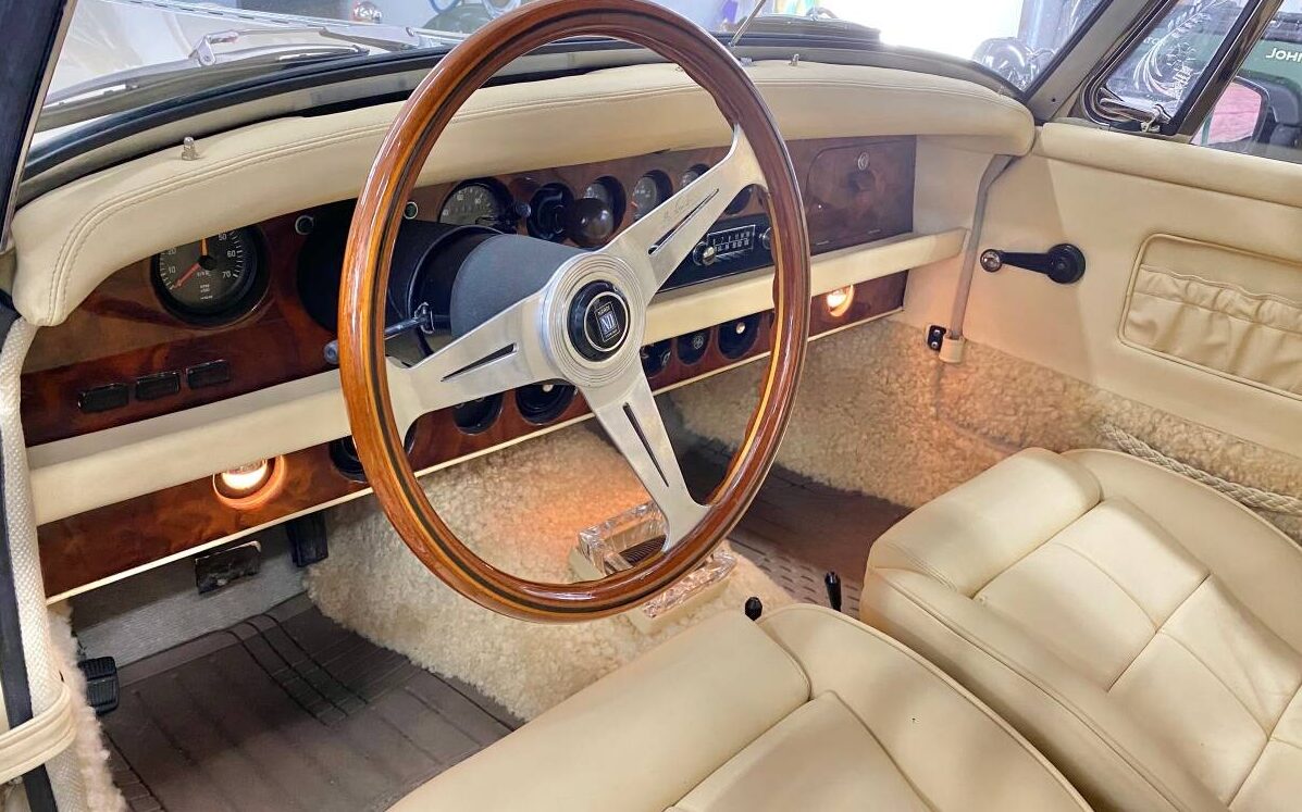 Rather than paraphrase, here’s the interior description, “Also included was English leather upholstery, lambswool carpeting, a solid walnut dash, a crystal ashtray and accessories, cut glass wind laces, soft top, as well as a color-matched tonneau cover. Danish teakwood accents…“. It is amazing that the environment is as clean as it is as all of those light shades are just dirt magnets – something as simple as a slightly grimy paw-print will make itself known not to mention what will happen with those blond wool kick panels. Then again, all of it is new and should look perfect but the fact that it had to be replaced validates my assumptions about the degree of difficulty in the cleanliness department. From what can be seen, the walnut instrument panel appears to be lacking in ostentatiousness and bears a nicely arranged gauge functionality about itself.