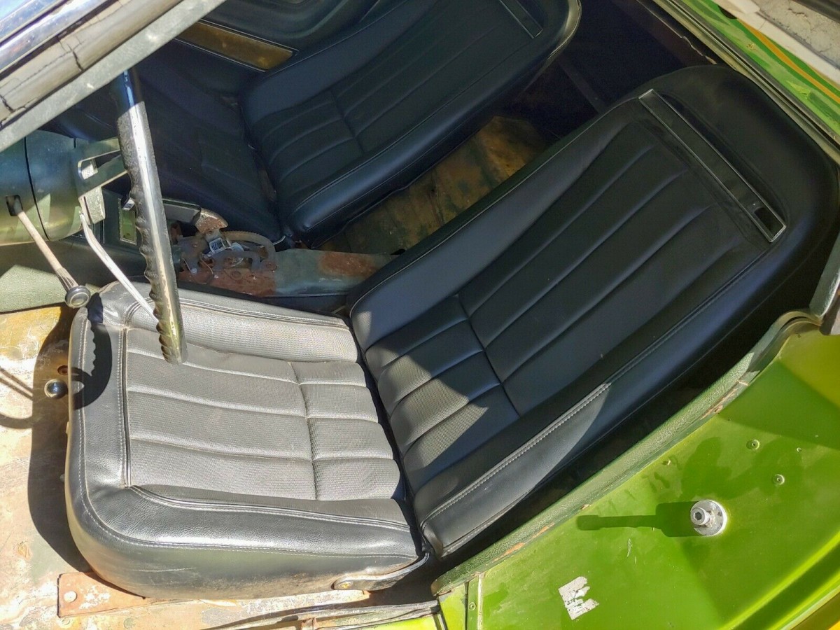 Inside we see that the carpet has been removed in addition to the cover for the emergency brake. The seller tells us that the previous owner ripped out the green shag carpeting and gold velour seat material. Additionally, the seller has new door sill plates, door panels, and other interior parts to add to the sale. Replacing the carpet also gives you the opportunity to put modern insulation all along the cockpit. These cars need it, as that engine heat has to go somewhere. The seats were obviously recently recovered. The reproduction GM black vinyl looks very good in these cars. It also holds heat in the summer like you would not believe. If your parents had a car with vinyl seats in Florida you brought a towel or refused to wear shorts. Any of you remember this?
