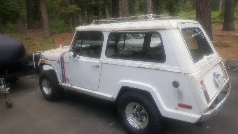 The interior has been refreshed at some point, and actually has the effect of making this Jeepster look like a fine place to spend time despite the rough exterior. It has been redone, but not in an original upholstery pattern. It does need new floor pans, which are included with the sale. The Hurst dual gate shifter remains in place, but the original tach (along with the original hood scoop) were both stolen and not replaced.