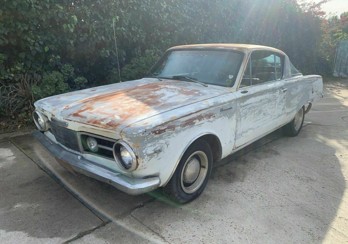 Under the hood resides the Barracuda’s original 273 cubic inch V8 and may be a bit rare as it’s paired with a factory 4-speed manual transmission. No production numbers on that pairing are available as many of the vehicles either had a Slant-Six engine or TorqueFlite automatic or both. We’re told the motor will need to be rebuilt, but that shouldn’t be a difficult or expensive proposition. The good news here is that the big wraparound rear glass is intact, not an easy item to replicate. When fully restored, this could be a $30,000-something car according to Hagerty.