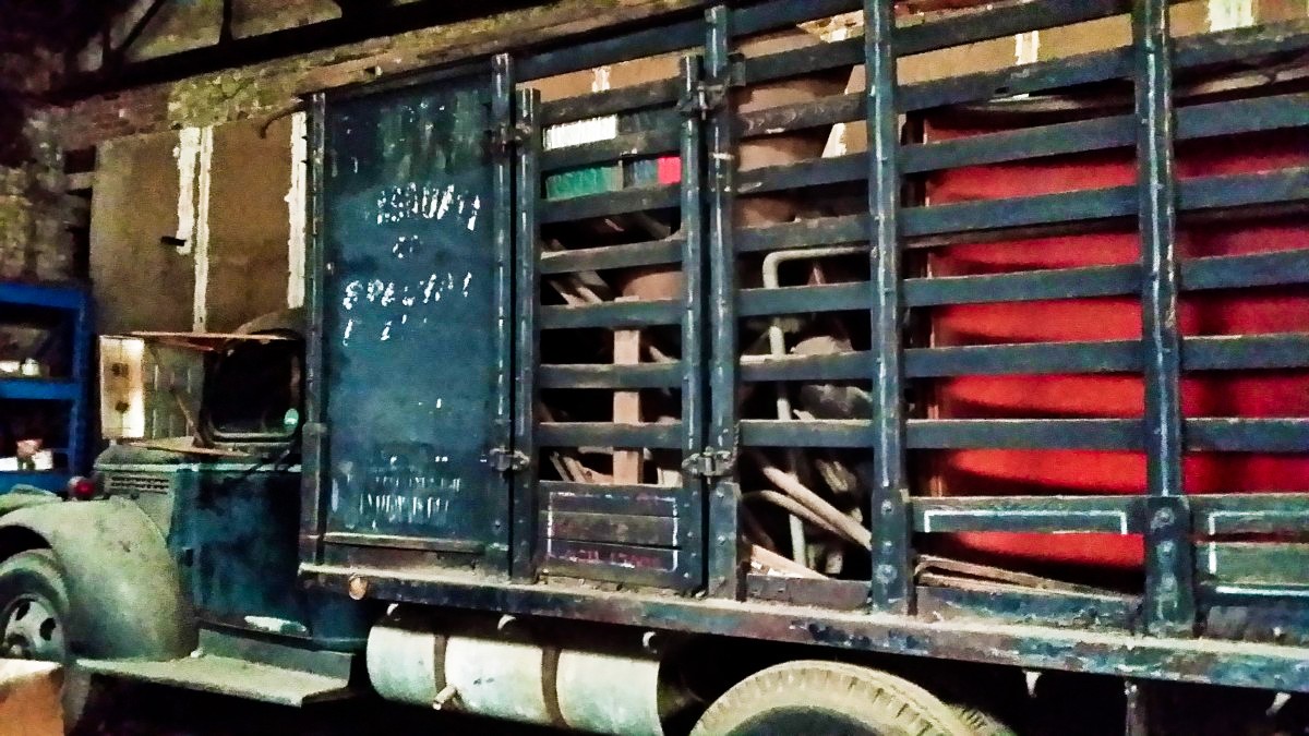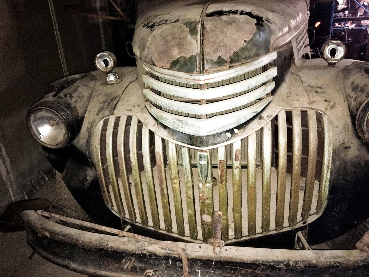 As I wandered through the US, I collected many license plates in all the states I visited, and as it got colder I started nailing the license plates between the slats in the sides of the truck because the wind would blow in under the canvas in the cold. If you look you’ll see a few of those plates still left up there. The whole stake sides are oak. The last place it was licensed was Wyoming, as you can see from the bucking bronco. By the time I got out west, that 235 was not enough for the Rocky Mountains, so I bought and installed a two speed rear end in Tucson all by myself. I almost got killed when I had it up on concrete blocks and one broke and I was pinned underneath, but obviously survived. It is a vacuum takeoff rear end and gives you four more gears. That also brought it up from 1.5 ton to 2. I traveled for several years until finally coming back home to New York and finding my parents were getting divorced and selling the house, so I towed one of my Morris Minors with Gipsy and moved down to Atlanta. Once here I didn’t drive the truck that much, I rented it out for a couple of movies like Greased Lightning with Richard Pryor, etc. But then it has sat here for 30 years in the back of this warehouse. Vandals used to throw rocks at the building’s windows and break my outside windows and then also break the windows of my cars. But the glass is all flat glass so it’s easy to repair.
