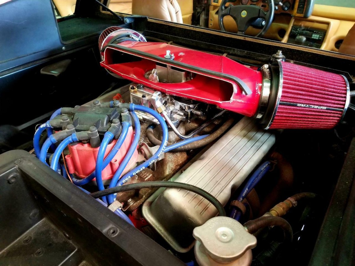 As previously mentioned, the original 4-cylinder engine was replaced by a 350 cu.-in. Chevrolet V8 engine, which pairs to a 5-speed Renault transmission to power the rear wheels. The odometer was reset after the engine swap and shows approximately 18,000 miles, and the engine has upgrades such as an aluminum intake manifold, a four-barrel carburetor, headers, and more. Additionally, the drivetrain received maintenance this past February, as well as an alternator and a “general tune-up.”