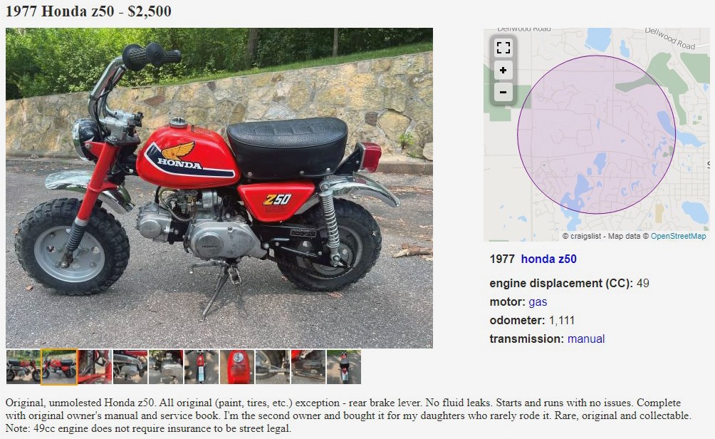 A late entry to the sales race, Honda owned the motorcycle market by 1977, at least as far as imports went. There were other makes, of course, but for small-cc bikes, there weren’t many that had as much of an impact (maybe not the best term) as the Z50. This 1977 Honda Z50 is posted here on craigslist in Stillwater, Minnesota, and the seller is asking $2,500. Here is the original listing.