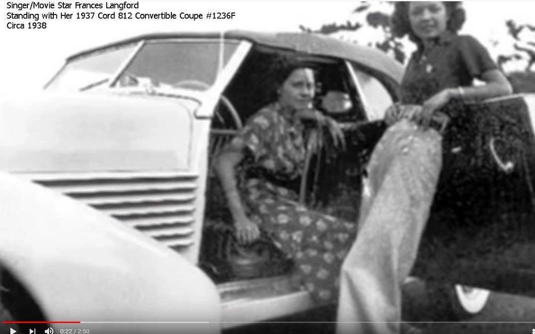 Frances Langford’s car was reportedly painted in a color that Cord called “Cigarette Cream” which could be anything from ivory to yellow, with a maroon interior. Whatever, as noted by others the photo of Ms Langford appears to be a phaeton body style (rear seat) while the car for sale is a coupe.