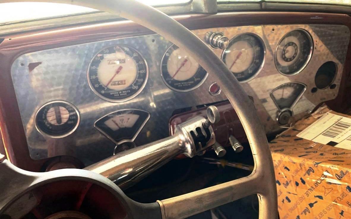 The engine-turned dashboard gleams, presenting the driver (and passenger) with an array of information. Note the jewel-like shift lever (four-speed with overdrive!) on the oversized chrome stalk, another splendid meld of design and engineering.