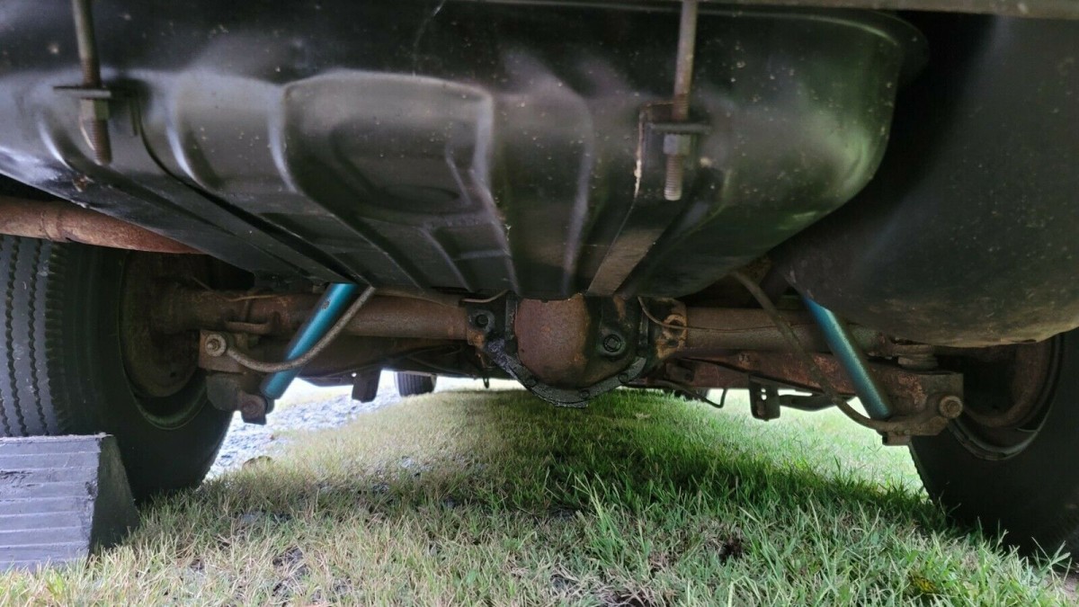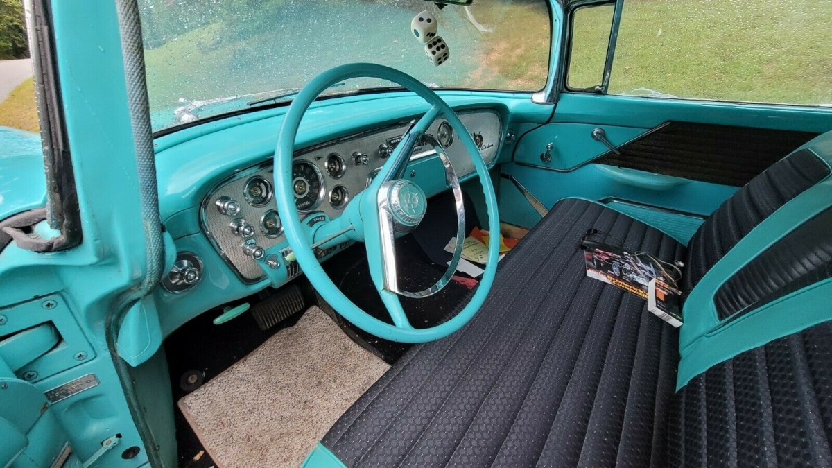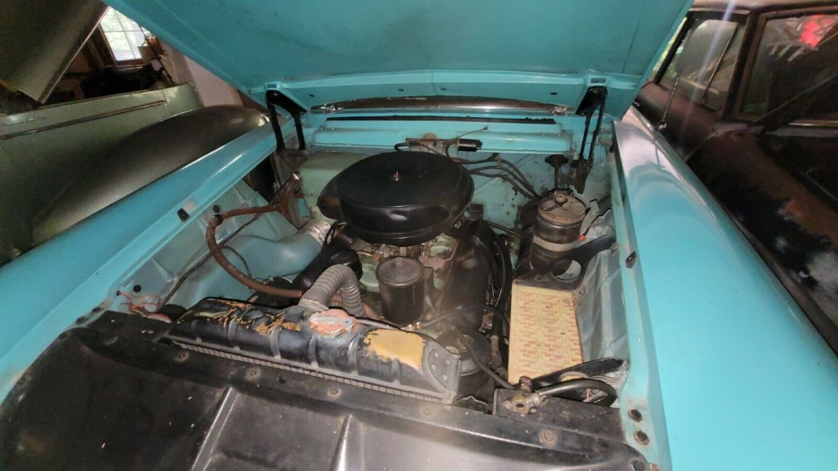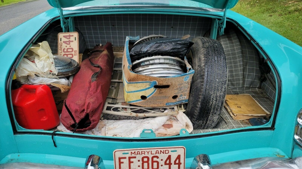 The car must have been reupholstered at some point, because the two-tone turquoise-and-black interior is quite nice. The painted metal looks freshly redone, and the weatherstripping must have been renewed around the same time. I’d be surprised if that’s not a new headliner, too. The trunk has a lot of old hubcaps in it, but the vinyl liner appears to have been replaced in recent memory—in any case long after Eisenhower was in power.