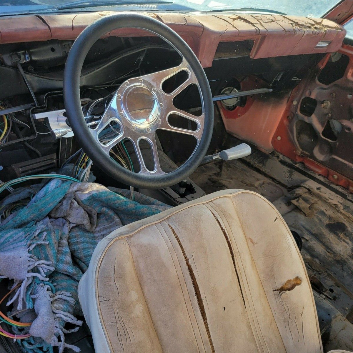 The interior is disassembled and in poor condition. An aftermarket steering wheel is the only thing that looks functional. There are wires hanging out of the dash and no door panels. The seats are included but are worn and splitting on most seams. The car was originally red with a white or cream interior.