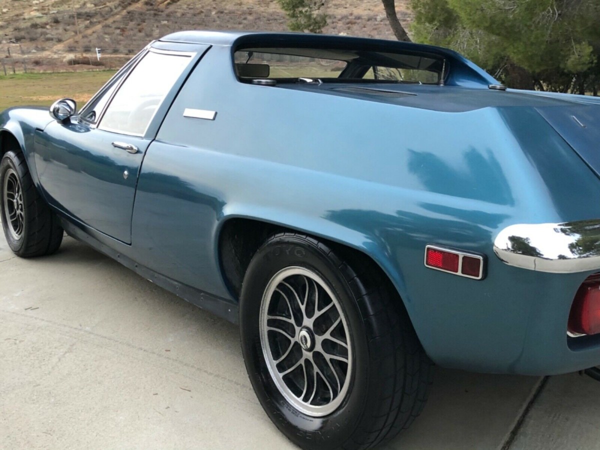 From this angle you can see where the sail panel was lowered on later models of the Europa. Given that slit of a rear window, I don’t know that it helped rear visibility that much, but to me it did make the car more visually appealing. The seller has refurbished Cosmic Mk. I wheels on the car which is a common sight; the original wheels are included as well. That’s Lagoon Blue paint, an original factory color.