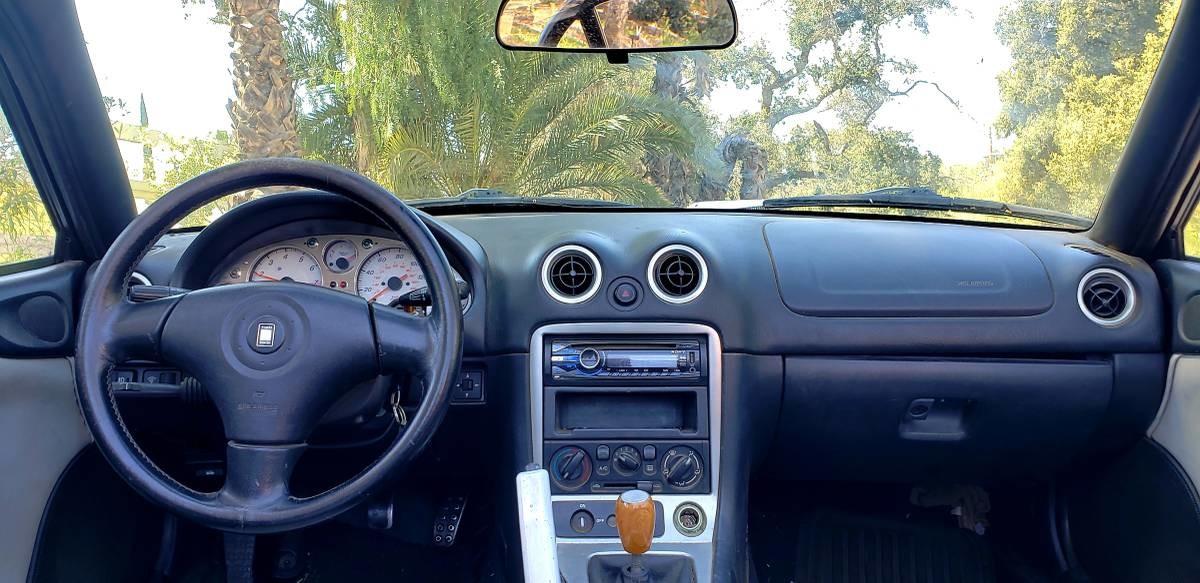 The ad doesn’t say if the add-on bodywork is steel or fiberglass, but the car appears to retain some of the Miata’s original steel panels, with the “Alfa” components slotted in. The doors look like unchanged Miata items, as well as the windshield. I should know since I own a 1999 Miata (the first year of the NB) in this same color. I also had an Alfa Spider, circa 1976, and both cars are a lot of fun.