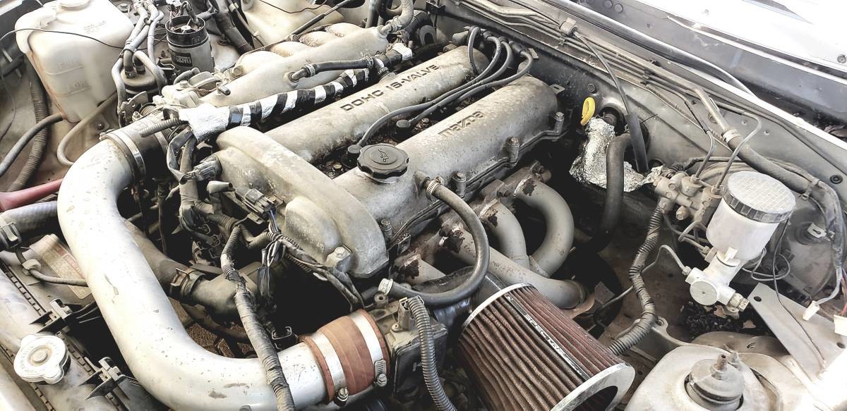 The engine bay is scruffy, with tin foil heat shielding and an aftermarket Spectre air filter. But if the 107,000 miles is actual then it may well “run good”. It’s worth noting that both the Alfa Giulietta and the Miata use twin-cam fours, though the latter is much more modern and offers a considerable power increase.