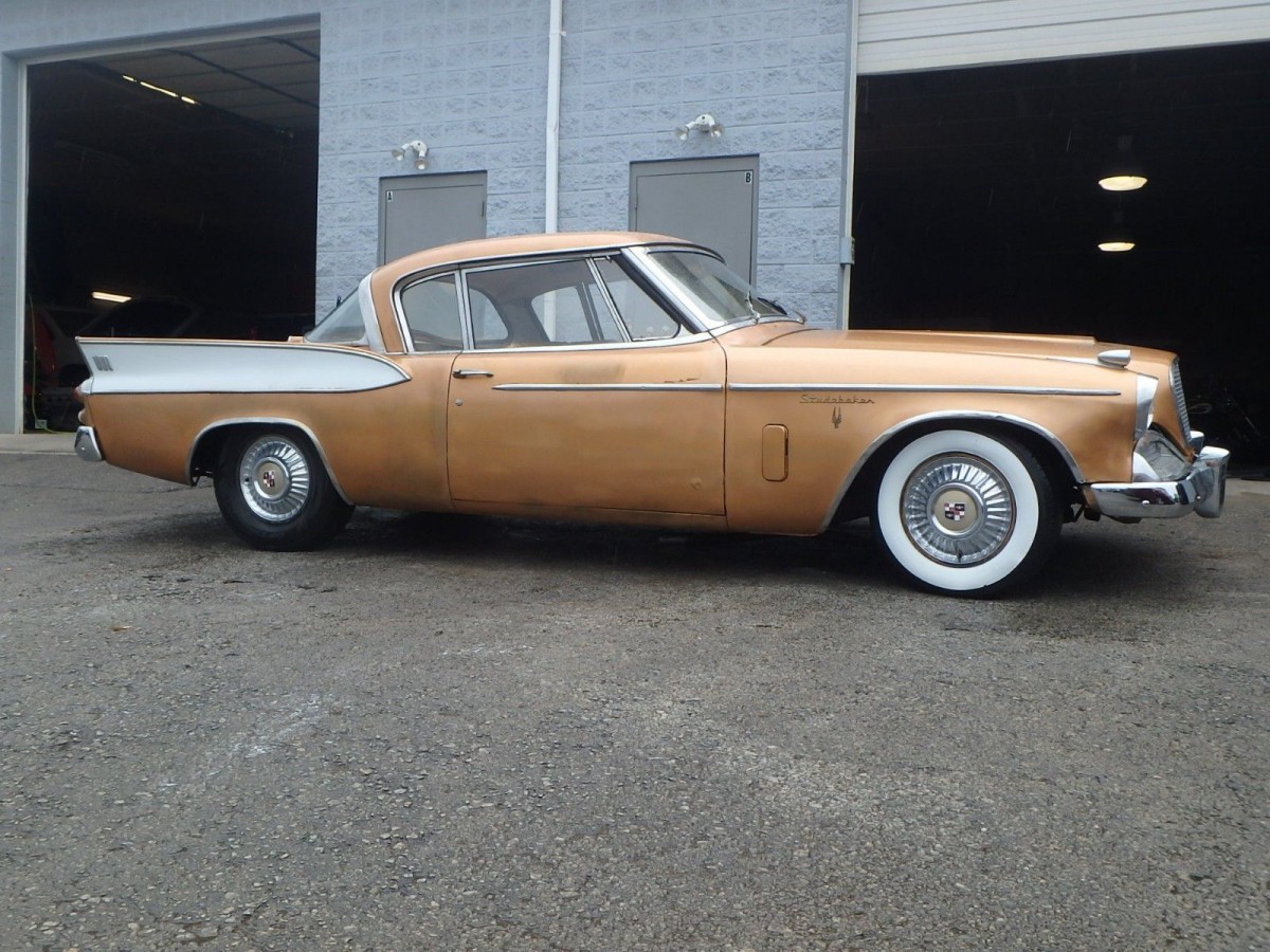 Pretty sure this car started out as a corrct 57 Golden Hawk with super charger. It has just been kicked around over the years and lost lots of parts. As mentioned, wrong hood wrong seat transmission converted to floor, these cars had a number of options in tranny combinationations as stated akk correct Golden Hawks had th e S.C, as for the bumper guards they sued these same type guards on near all Studes and Hawks through 61, But the bumpers wew different on Hawks and Sedans and the cutouts were different and left right, front back were different and could be bolted on but fit different giving appearences like this. Just goes to prove just because they look the same doesn’t mean they fit. They had a High dollar edition model of which were a beautiful very low production interior that are seldom seen. And no these were fast for the day but were no comparison to the last years of the Avanti Powered Super Lark engines that broke records at Daytona but still made believers out of a lot of Chevy, Mopar, Ford guys in the day. All the correct parts are out there including the S.C, and for 35 bucks the SDC Museum can provide a complete build sheet with all the info. Hope it gets a good home. Also Classic Enterprises has every panel you need