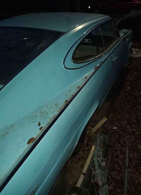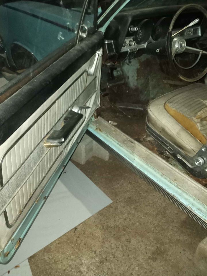 The color is described as blue, but it looks turquoise to me and that was an attractive color on the Marlin new, especially when it was combined with white as a two-tone paint job. The lighting isn’t good in the garage or barn where the car is now, so it’s hard to tell if rust has been an issue. But what we do see of the car looks pretty straight. The hood is still there, just not pictured. The white interior is going to need most everything done, from seat covers and carpeting to headliner and door panels.