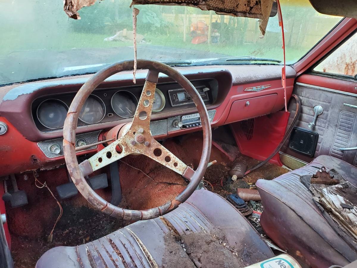 The owner states that the Pontiac comes equipped with a 389ci 4-Barrel V8 and a 4-speed manual transmission. This was a potent package when the car was new, and helped to cement the GTO’s legendary status. This was a car that was capable of demolishing the ¼ mile in 14.6 seconds, and that was big news back in 1964. The owner doesn’t indicate whether this is a numbers-matching car, but I have noticed one detail that raises a small doubt in the back of my mind. The valve covers on this engine appear to be painted in the standard Pontiac engine color. I’m positive that all ’64 GTOs came equipped with chrome valve covers, but I’m happy to be corrected if I’m wrong on that point. It may just be that the valve covers have been replaced at some point. However, when we are talking about a project car in such an advanced state of decay, this would be a matter worth checking. If this isn’t the original engine, then it will potentially have some impact on this project’s financial viability. The other issue is that we don’t know whether the engine turns freely, so that is a further thing to consider. Interestingly, this glimpse is the only shot we get of the engine. I suspect that this is as far as the hood can be raised without the danger of it snapping off its hinges.