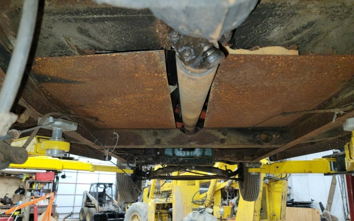 There is definitely some homegrown construction going on underneath. It appears as if thick sheet steel has been employed to suffice for floors as a result of modifications undertaken to accommodate the transmission and modified cross member. You gotta’ love homegrown machinations and that get-it-done mentality but the mods, in this case, look a bit shaky. And there is evidence of frame corrosion too.