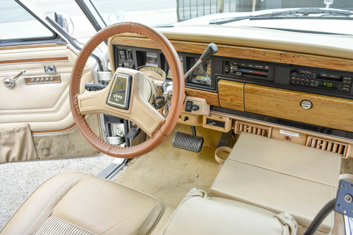 The interior looks to be in respectable condition, with handsome fake wood trim and a steering wheel with an attractive wrap on it. The tan carpets show no major soiling, and the door panels look clean as well. It even looks to retain a factory cassette deck. The seller notes that a previous owner installed a variety of odd storage compartments, which do look slightly out of place but also appear to have been custom made for the Grand Wagoneer interior. He contends they work well enough to live with, and given they occupy space that would otherwise be unused, I suppose their existence is justified. The seller notes all power functions, from the seats to the windows, work as intended.
