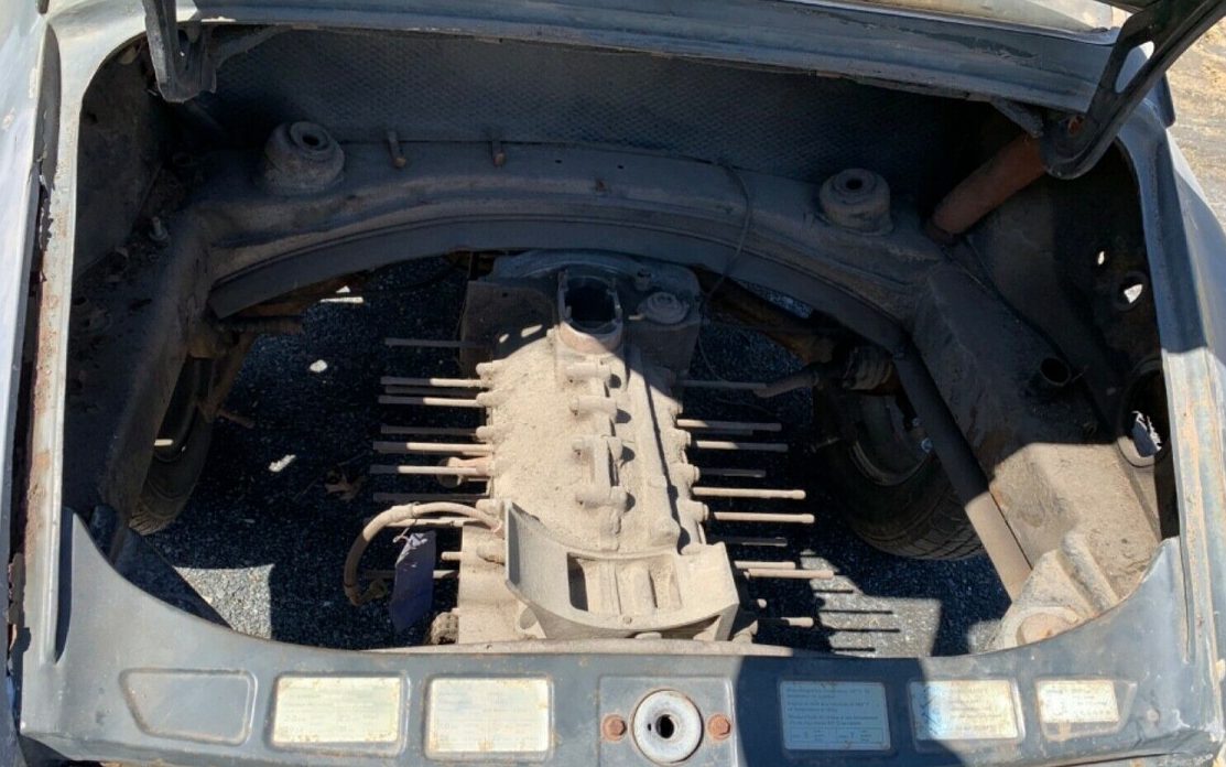 Under the bonnet is what’s left of a 2.0 liter Boxer 6 engine. The seller claims, “The engine is period Correct aluminum block with the all the internals crank, etc. not complete“. So, I guess what you see is what you get and there’s a bunch missing.