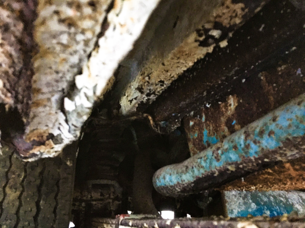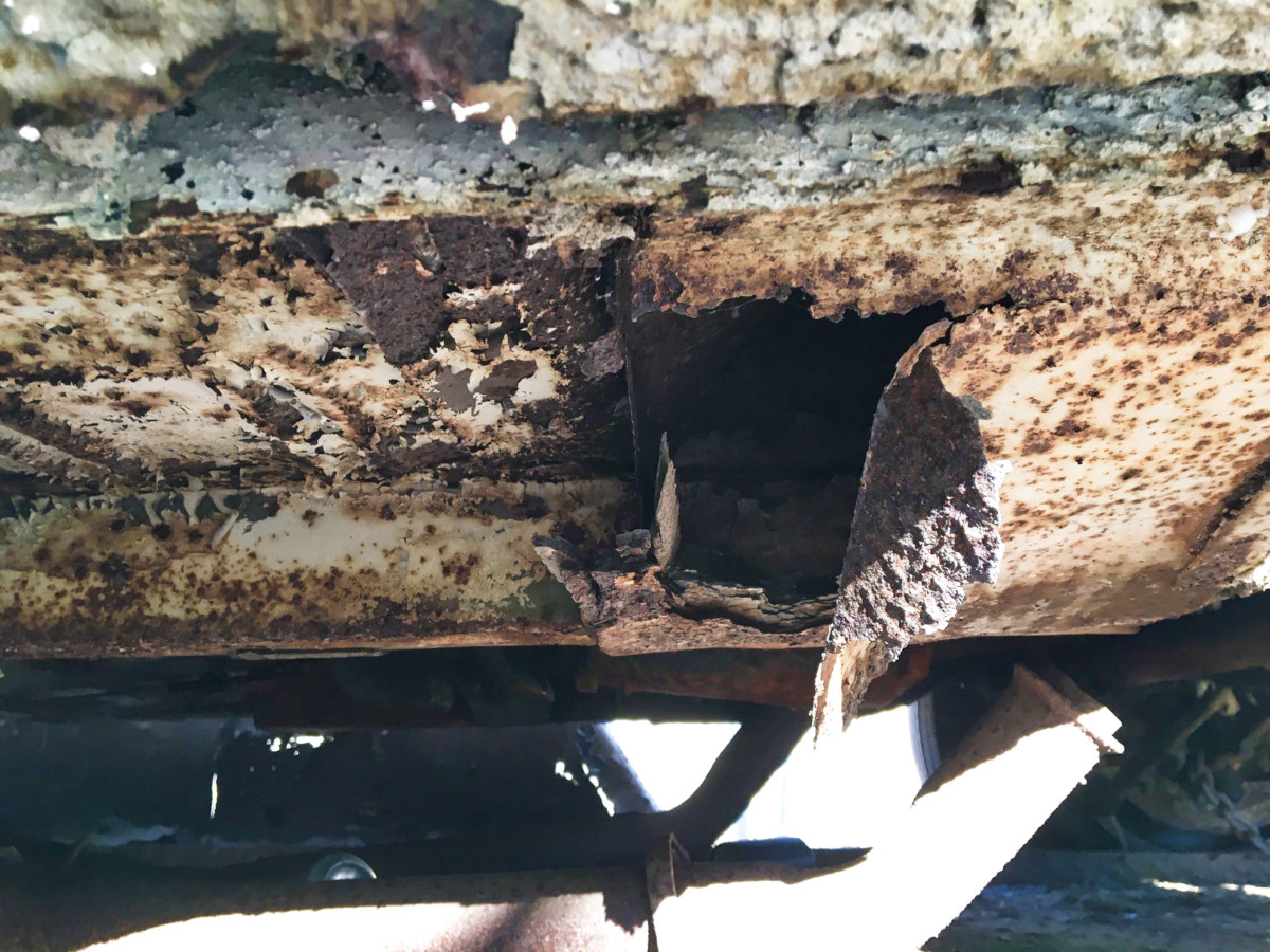 She is rough from sitting in the damp barn but at least it was up off the floor on the little car trailer, which might have helped some, but the rust has been aggressive. Torque boxes are blown out, there are perforations around the rear window, quarter panels are all the way through, rear bumper rotted through, all badging ruined, interior completely moldy, cracked and eaten by critters, wheels and possibly the rear end are locked up, and of course, no engine. Is this project savable? Anything can be saved for the right amount of money, right? To make it worth it, all the numbers better match which leads us back to the engine.