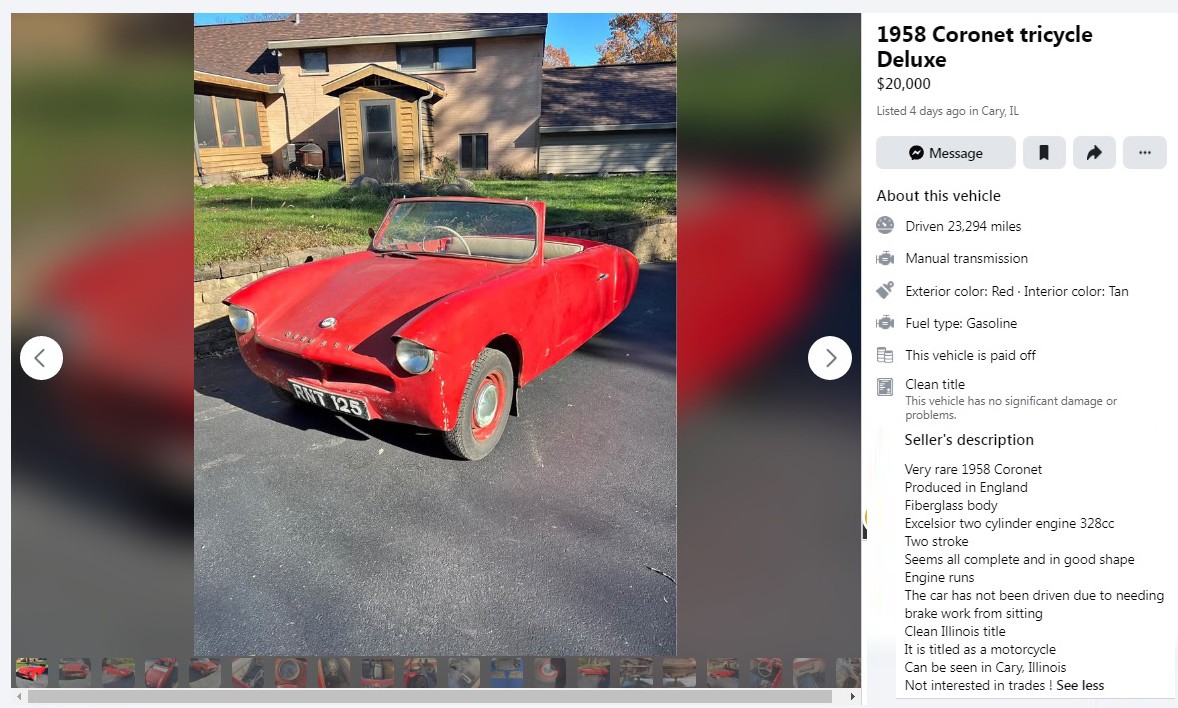 Advertisers sometimes still take liberties with the truth (have you seen the fake overacting on infomercials lately?) despite there being at least some modicum of laws now to ward against false advertising. This 1958 Coronet three-wheeler, once advertised as “The World’s Best Three-Wheeler,” is listed here on Facebook Marketplace in Cary, Illinois, and they’re asking $20,000. Here is the original listing, and thanks to T.J. for the tip!