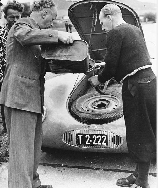 From Randy Leffingwell’s “Porsche, A History of Excellence”, “In mid-1949 Austrian racer Otto Mathe purchased this Type 60K 10 from Porsche and registered it in his home district of Tyrol………..He had lost his right arm in a motorcycle accident before the war, so he had mechanics convert the car to right-hand drive so he could steer and shift with his left arm” The last two black and white photos show it as a right-hand drive. When and who changed it back? It was given the type number 60K10 (the 60 representing the standard VW project number, the K10 indicating that this was the 10th special body)