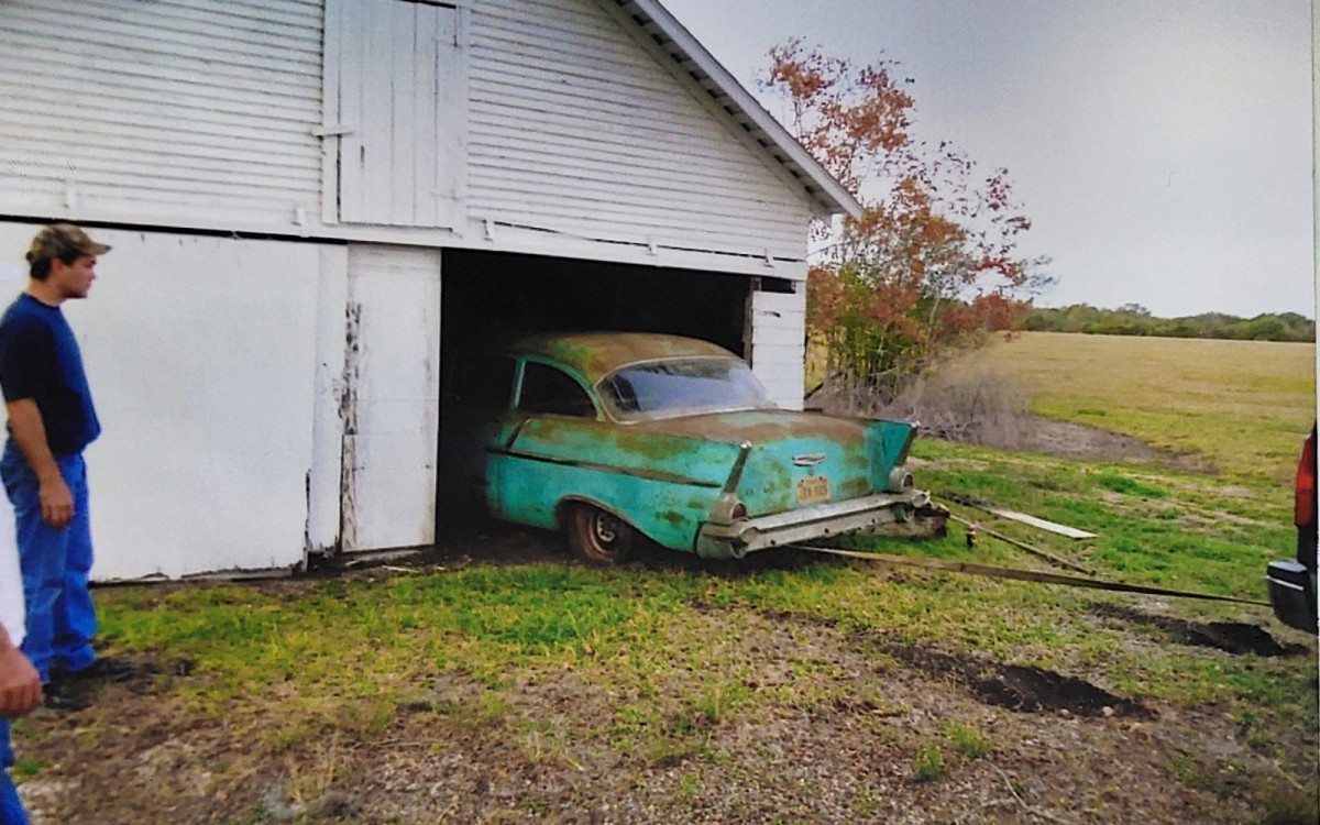Enclosed are pictures of a 1957 Chevy that was found while painting a ranch, west of Roshar, Texas. It had set in this barn for 23 years after 2nd owner had gotten too old to drive. It was complete, except for the battery. All 4 tires were flat, they were changed out as soon as we drug it out. We installed new plugs, points, a battery and it started. I’m waiting on a new gas tank & fuel pump, then intend to drive it to the local cruise nights & car show. I will swap the 6 cylinder out later for 350 or perhaps an LS1. I am really proud of this find. They are still out there…