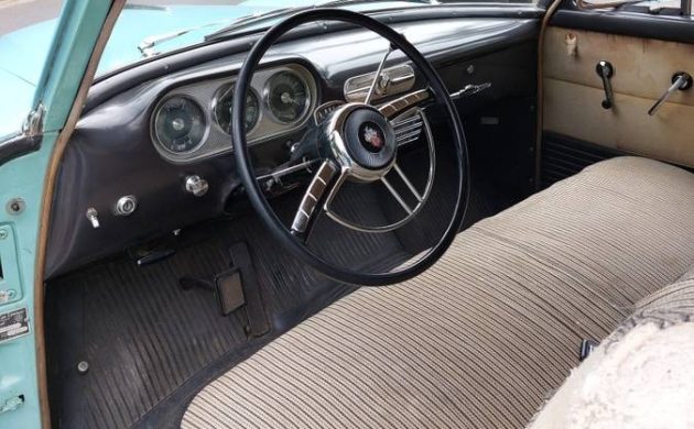 The interior looks like an entry-grade level affair and is typical for the era, with mattress-striped fabric upholstery (seat cover?) and muted hues for the door panels and headliner. The driver’s side seat backrest looks like something took a chunk out of it and will obviously need a redo. A rubber mat, not exactly Packard province material, covers the floor. The dash and instrument panel, however, seem to have fared well.