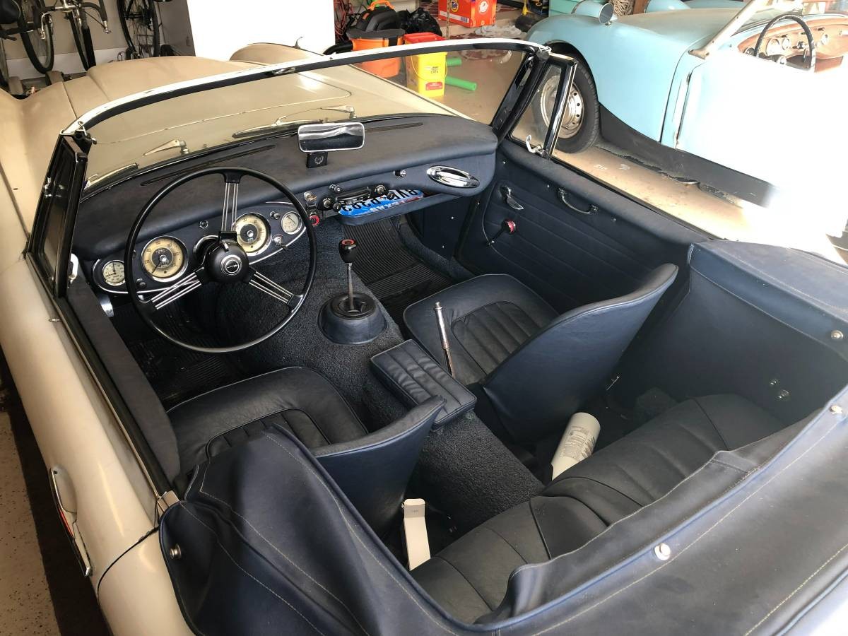 It’s an honest driver, with an attractive cream and blue two-tone paint job. Of course, that paint “is old and tired and will need to be updated,” but you can certainly drive it like it is without being too embarrassed. The owner is definitely an enthusiast, note the Bugeye Sprite in the other garage bay.