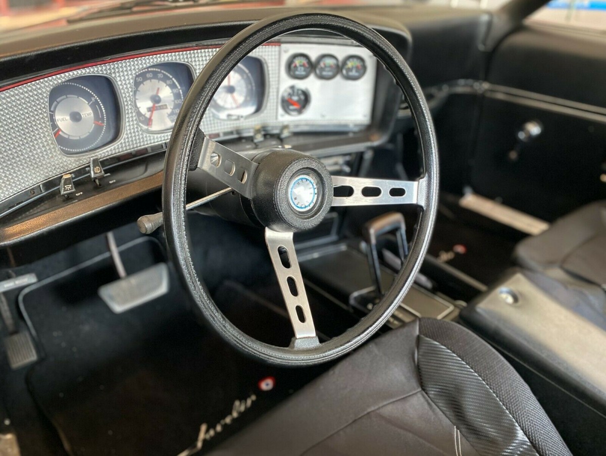 The Javelin rolled off the line with a 304ci V8, a three-speed automatic transmission, power steering, and front disc brakes. With 150hp available to the driver, it would have covered the ¼ mile in 17.4 seconds. That is hardly enough to get your pulse racing, although this AMC may be able to improve on that. The engine presents well, but that’s only part of its story. The owner has added an Edelbrock Air Gap intake, a Holley 600cfm Street Warrior carburetor, Doug’s headers, a custom bent 2¼” dual exhaust, and various other performance upgrades. He claims to have spent thousands, and when you examine the parts list, the claim is easy to believe. The result is a car that runs and drives perfectly and could be driven anywhere.
