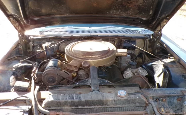 Under the Montana-sized hood is a 345 gross HP, 390 CI V8 engine fed by three 2-barrel carburetors and making the rear wheel connection via a Hydramatic automatic transmission. The seller tells us, “THIS CAR IS A MATCHING NUMBER 390 TRI POWER ENGINE. SHOWS 44551 ORIGINAL MILES. I PUT NEW PLUGS AND GAS IN THE CAR. IT RUNS WELL., GOES INTO ALL GEARS, AND STOPS WITH SOME EFFORT. I WOULD CALL IT A YARD DRIVER. IT HAS A NEW BATTERY, BUT NO GENERATOR BELT.” No generator belt? Why not? It’s probably a $20-$25 item.