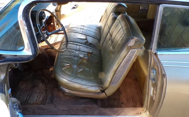 Inside, we find dilapidated gold leather upholstery and bare floors. The seller claims that the floors are sound, other than two small holes in the front passenger side foot well (though there is a lot of scale on the underside). But the environment is mostly complete with a non-damaged dashpad. I imagine it was quite a looker in its day, but can’t imagine what it would cost today to effect proper upholstery repair. This is an A/C equipped car, but the system probably needs attention as there’s no mention of its operational capability. The seller does state that the side windows retract.