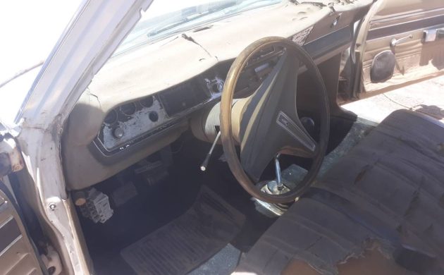 Speaking of that Arizona climate, it has done a number on the interior. The dash has collapsed, the door panels are wrinkling away, the instrument panel is highly delaminated, and the cloth and vinyl seating upholstery has significantly disintegrated. Despite all that, the sturdy-looking factory-installed three-speed floor shifter is still standing strong, waiting for its next go at rowing the gears.
