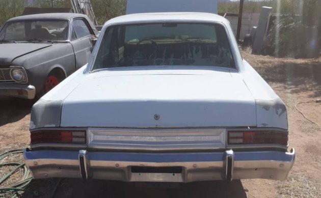 Plymouth offered three different Valiant trim levels in ’75: Base, Custom, and Brougham. This one’s not identified, but it looks like an entry-level model. Assuming that’s the case, it’s one of 44K assembled that year. Reflecting on Lynyrd Skynyrd’s 1975 album release, “Nuthin’ Fancy“, that could be an apt description for this car born that same year – it’s just the basics. And, it was the right car for the times, considering our stagnant punk economy and runaway fuel prices. The seller tells us the body is “very good,” and that may be due to its Arizona locale – no rust; rot being the Mopar A-body’s biggest Achilles heel. The Powder Blue finish has as much powder going on as it has blue, but it’s still reasonably presentable. This was not a trim-heavy car, but what it originally had is partially missing. The big railroad tie-sized front federal bumper appears to be unkissed, but the grille is missing a tooth or two.