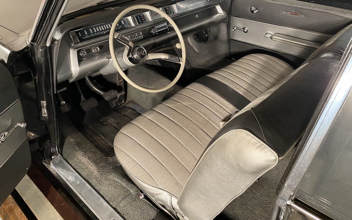 The interior’s condition pretty well aligns with the exterior’s as it is in fine nick. It’s a fabulous, two-tone, cloth, and vinyl upholstery environment that contrasts perfectly with the ebony exterior. The seller mentions some diver’s side armrest wear but that’s it, nothing else looks out of place or appears to need attention. The instrument panel is handsome in its various materials and textures chosen – Olds always had some of the best. And yes, there is an original Delco radio in place.