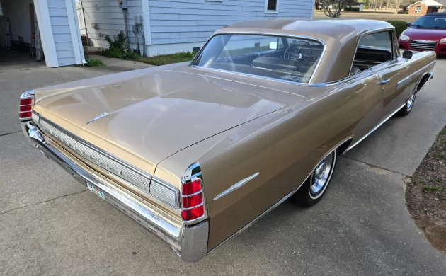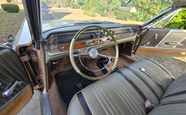 When buying any early 1960s GM full-size car, it’s important that the interior is in good condition, because upholstery is not only hard to find but also very expensive. And it would be a shame to upholster a Pontiac in anything but its original fabric, because they were as stylish inside as they were outside. The interior goes very well with the car’s “Saddle Bronze” paint. Some paint work has been done; the seller doesn’t mention if it’s had a complete new paint job or just some judicial blending, but it looks good in pictures.