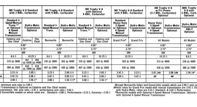 I’ve attached the engine lineup from the brochure. It’s a little confusing, but no 389 aside from the 235-horsepower version appears to be available on the Bonneville with a three-speed, unless you stepped up to a Tri-Power car with a “Heavy-Duty” three-speed.