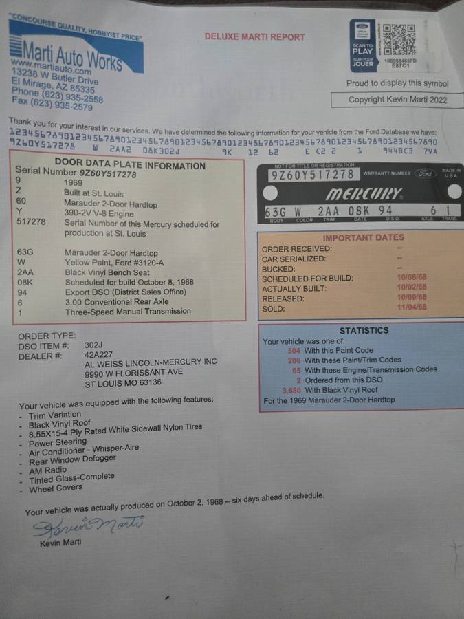 Fun write-up Mike on a very interesting car. The back story and the three-on-the-tree make the car. The Air Force pilot who ordered the car knew exactly what he liked and wanted; admit it, I’d say most of us Barn Finders fit in this category. The Marti Report confirms the car, and it would be fun to see the referenced telegrams between Ford and the ordering dealer. “Are you sure you want a three-on-the-tree in this Marauder? You have a buyer for this car? Or is it a typo?”