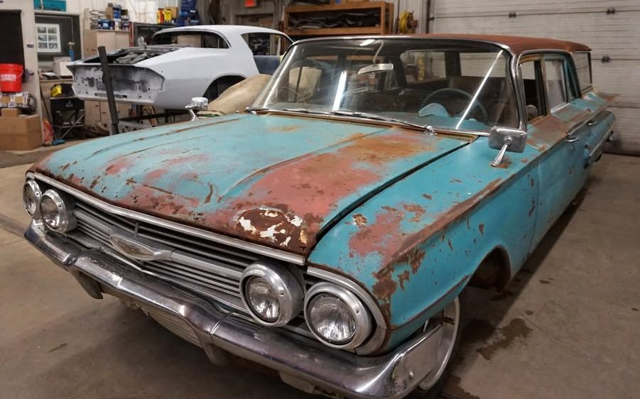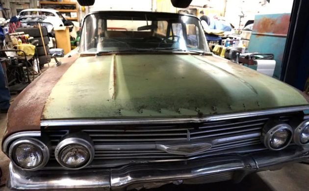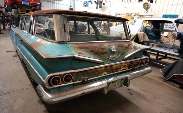Chevrolet’s esteemed “Nomad” model was still on the books in ’60, residing at the top of the station wagon heap. It was not, however, a stylish two-door body style, but a four-door variation that possessed no unique styling cues. Following, were the Parkwood and the Kingswood, essentially the same car, though the Kingswood was a nine-passenger model, while the Parkwood, such as our subject car, accommodated just six. Bringing up the markers was the Brookwood, available in both two and four-door varieties. Chevrolet’s total 1960 four-door station wagon count (the numbers aren’t broken down by model/trim level) reached 198,000 units, though there is a separate measure for the Brookwood two-door variety, the last full-size two-door wagon that Chevrolet offered, and it’s 14,600 copies. This one’s rough! It has surface rust and what looks like even more, though the body is straight and all of the stainless trim is still attached – the bumpers aren’t bad either. As for the floors and frame? An inquiry will have to be made. This Chevy will need a new windshield.