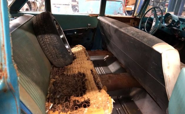 Under hood (either one, it comes with two) is a 230 gross HP, 283 CI V8 engine connected to a three-speed manual transmission. This wagon is equipped with overdrive, but it’s a non-runner. There’s no mention of completeness or the motor’s ability to turn over. The powertrain has seen at least 100,000 miles, so assume work or replacement will be required.