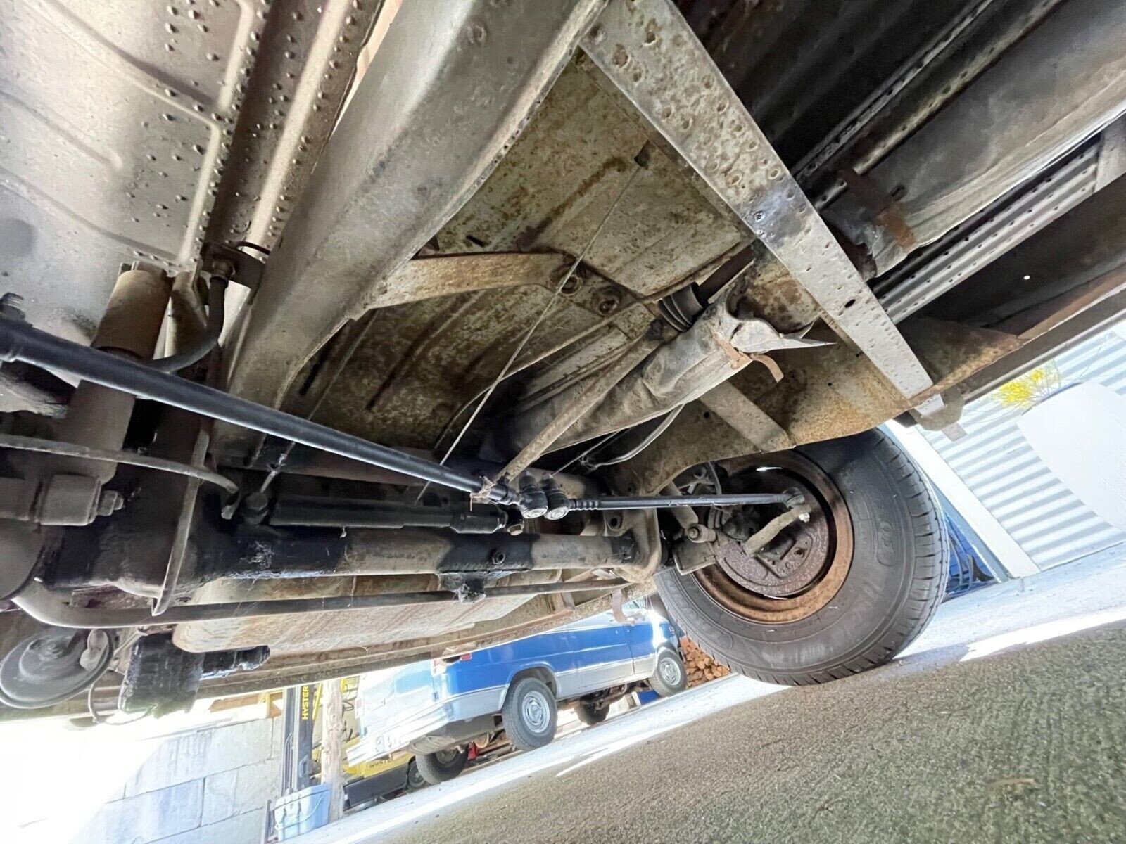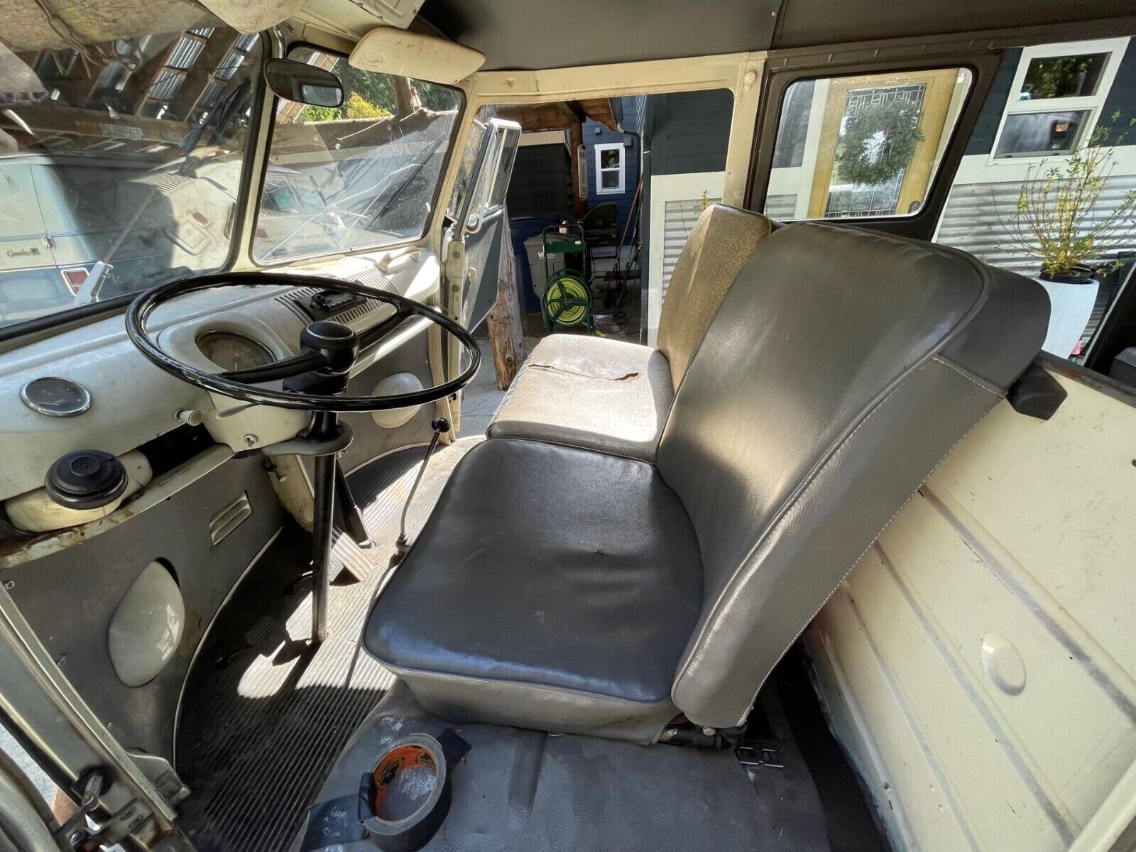 The driver’s seat has apparently been reupholstered in black or dark grey. The passenger’s side and rear seats are in wonderful condition. The seller does have the third-row seat which needs repair. The floors are mostly great. Only a couple of areas look rusty at all, and I think remediation could avoid a sheet-metal repair. It’s clear that other than making repairs to keep the bus serviceable – and perhaps those repairs date from decades ago – this bus has never seen a restoration.