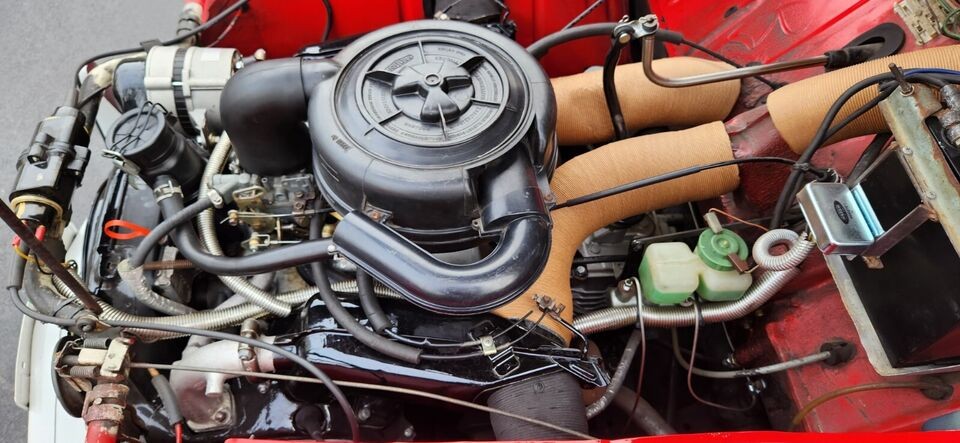 The interior is the epitome of spartan, with a messy binnacle inset haphazardly with a minimum of gauges, indicators, and switches. Everything is said to work, though – including the dome light and windshield washer! The seat springs were replaced. The top peels back and rolls up, and it’s new. So are the tires and those 15″ wheels were stripped and repainted.