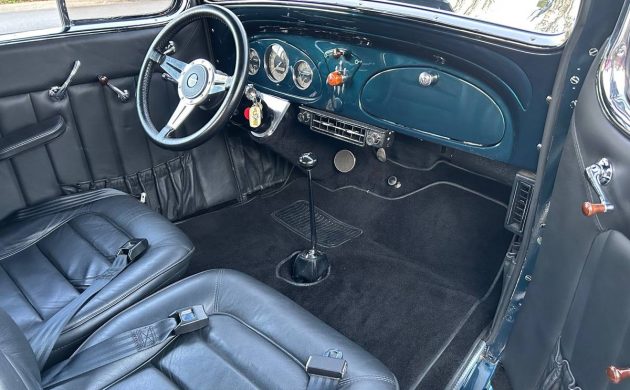 Okay, so we’ve looked at the exterior and mechanical specifications, and it is time we focused on this Coupe’s interior. Once again, the attention to detail is admirable. Every upholstered surface is trimmed in Black leather, including the Rumble Seat. There is matching carpet on the floor, and the painted surfaces continue the exterior Turquoise shade to tie everything together. The leather looks supple and inviting, the paint shines beautifully, and there is no visible wear. It isn’t merely about looks, because this interior features Vintage air conditioning, an effective heater, a GM tilt column, a Genie shifter for the Turbo 350, and a hidden Alpine stereo.